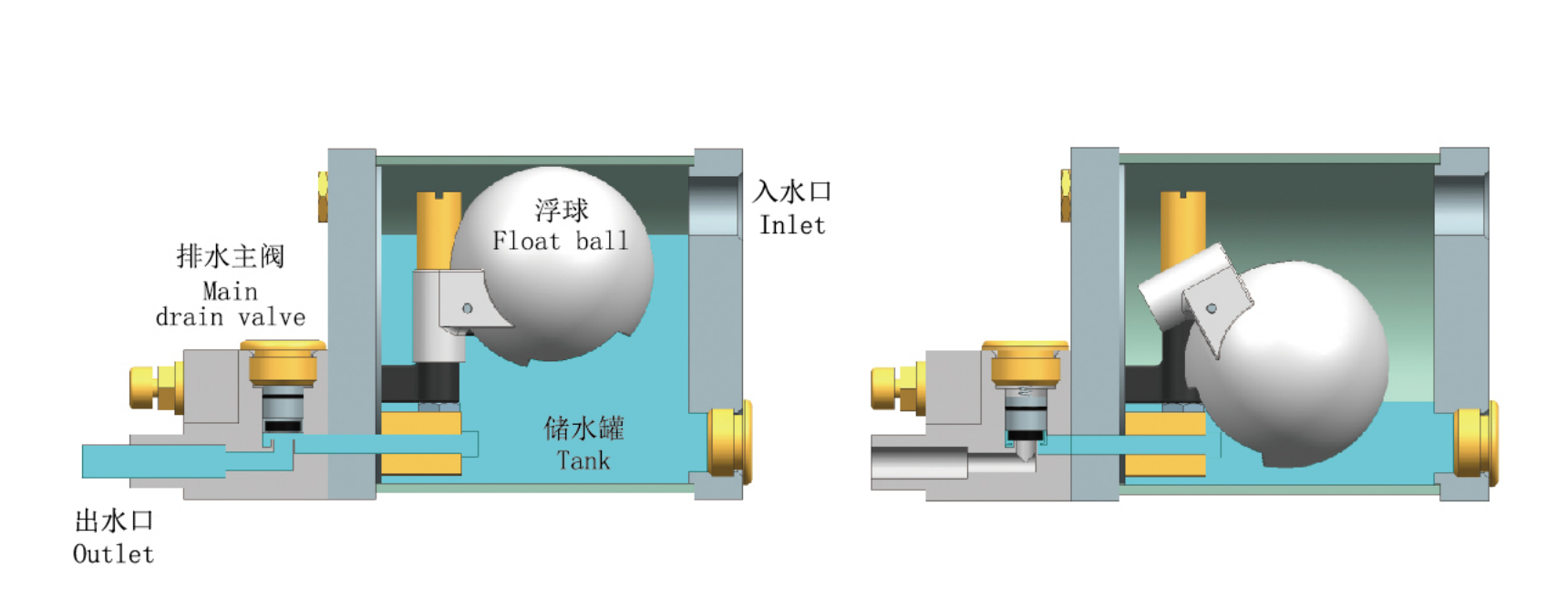 ◆ 当浮球降落到一定低位时,气动控制关闭排水主阀,停止排水;
