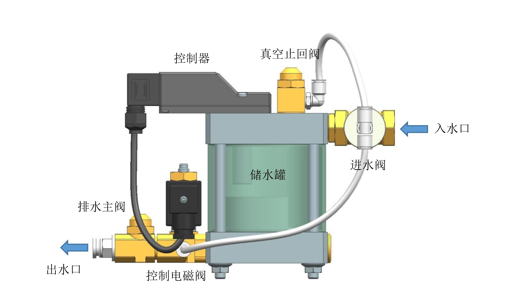 当水位升高到传感器感应点时,控制器发出信号,控制电磁阀通电,进水阀关闭,储水罐与真空系统隔离,同时外部压缩空气进入储水罐,排水主阀打开,开始排水;