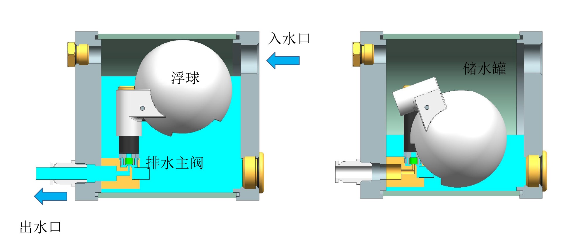 ◆冷凝水从入水口流入储水罐,储水罐水位持续升高,浮球跟随浮起;