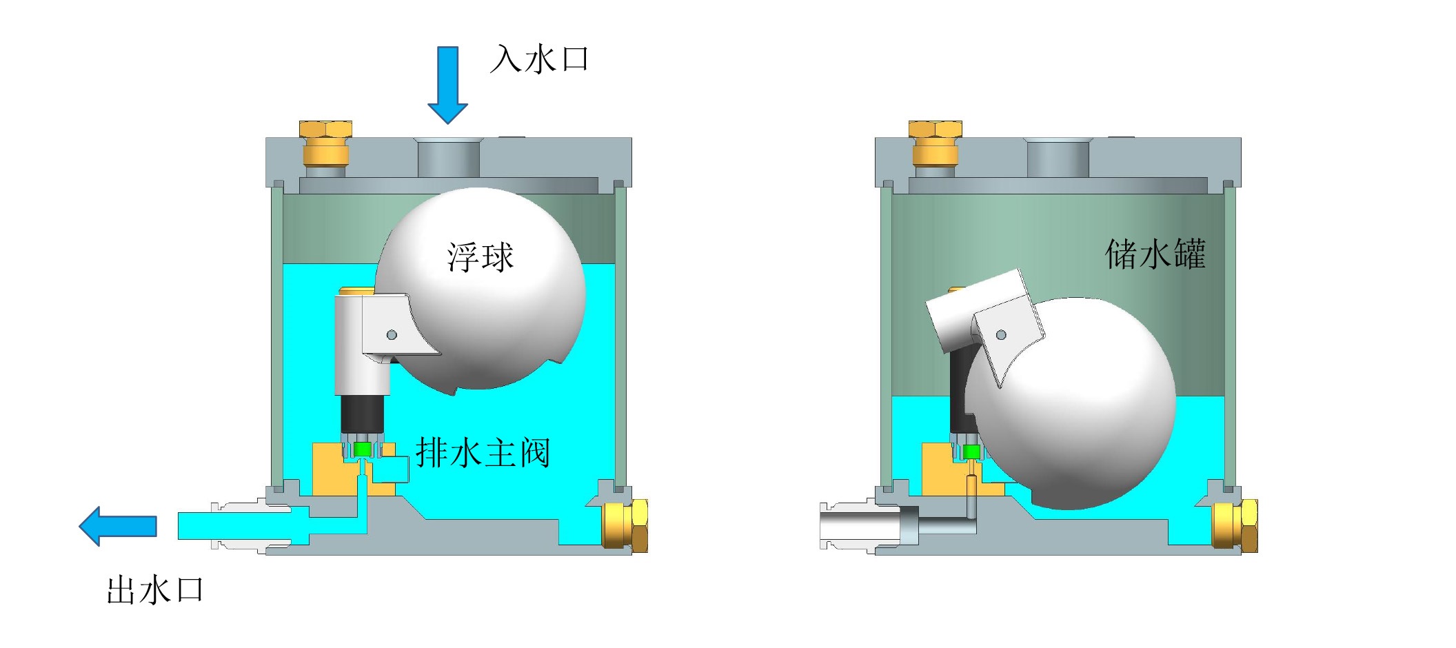 ◆ 冷凝水从入水口流入储水罐,储水罐水位持续升高,浮球跟随浮起;