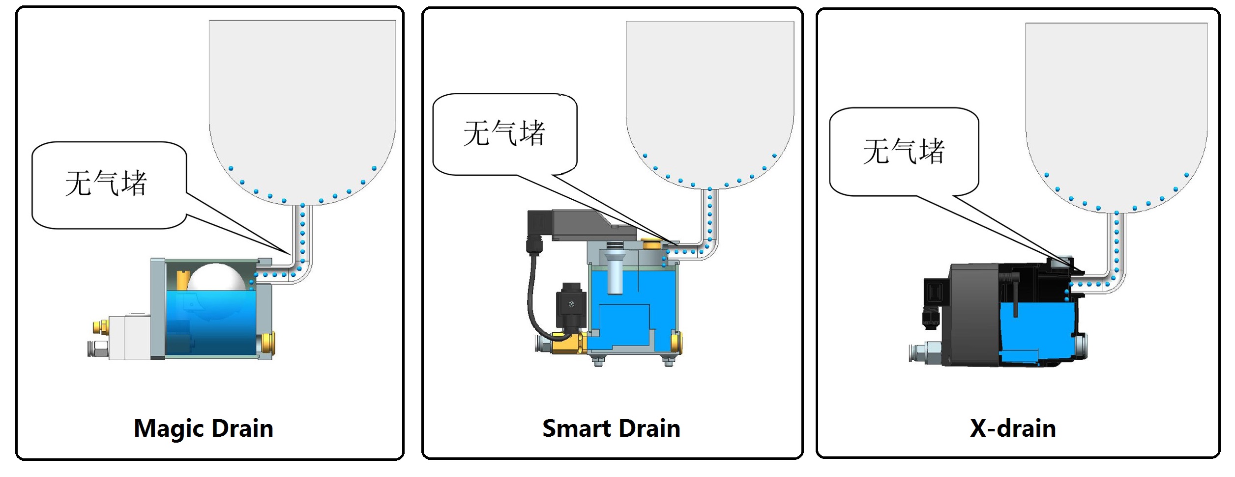 排水器在安装使用过程中最常遇到的问题就是冷凝水无法进入储水罐,其主要原因是气堵。